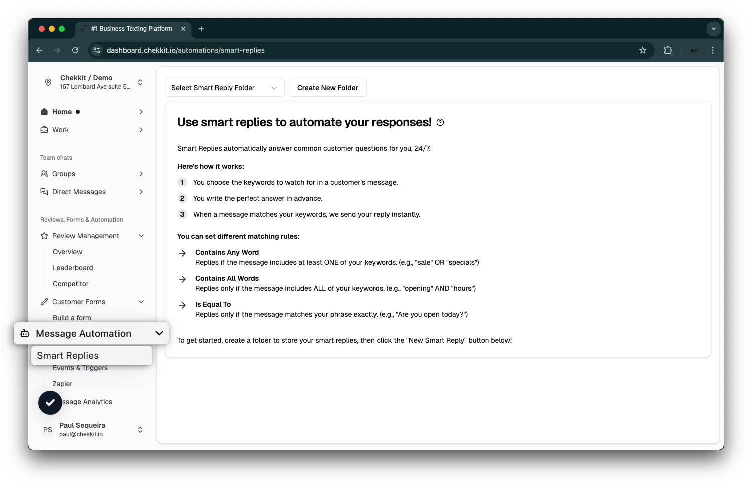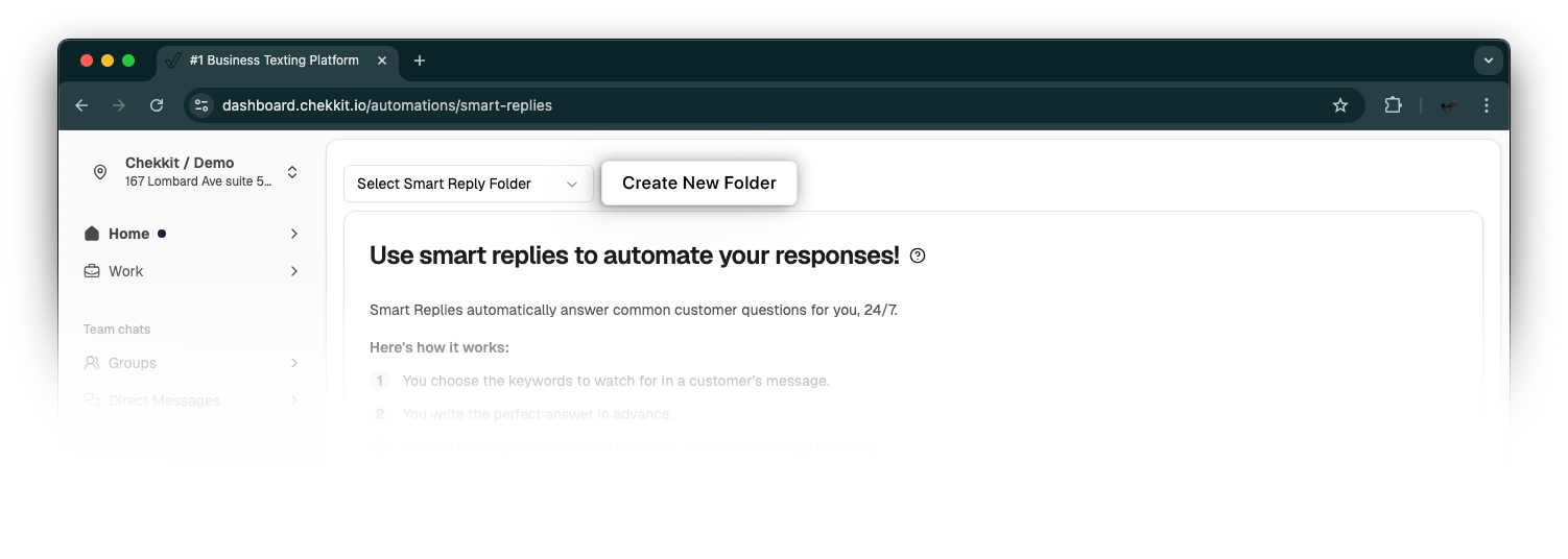 Create smart replies in Chekkit to streamline your customer messaging. Smart replies are intelligent, pre-generated responses based on the context of incoming messages. They help your team respond faster, reduce typing time, and maintain consistent, professional communication with customers. Whether you're handling high volumes of messages or just want to boost efficiency, smart replies can improve response times and customer satisfaction. This guide will show you how to customize, and make the most of smart replies within your Chekkit inbox.