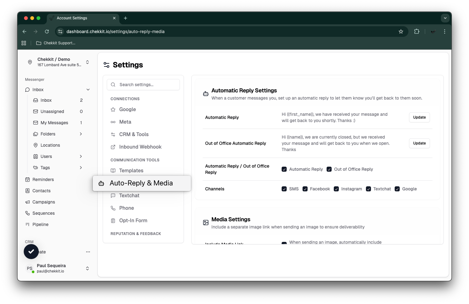 - From the left-hand menu, go to Settings → Auto-Reply & Media.