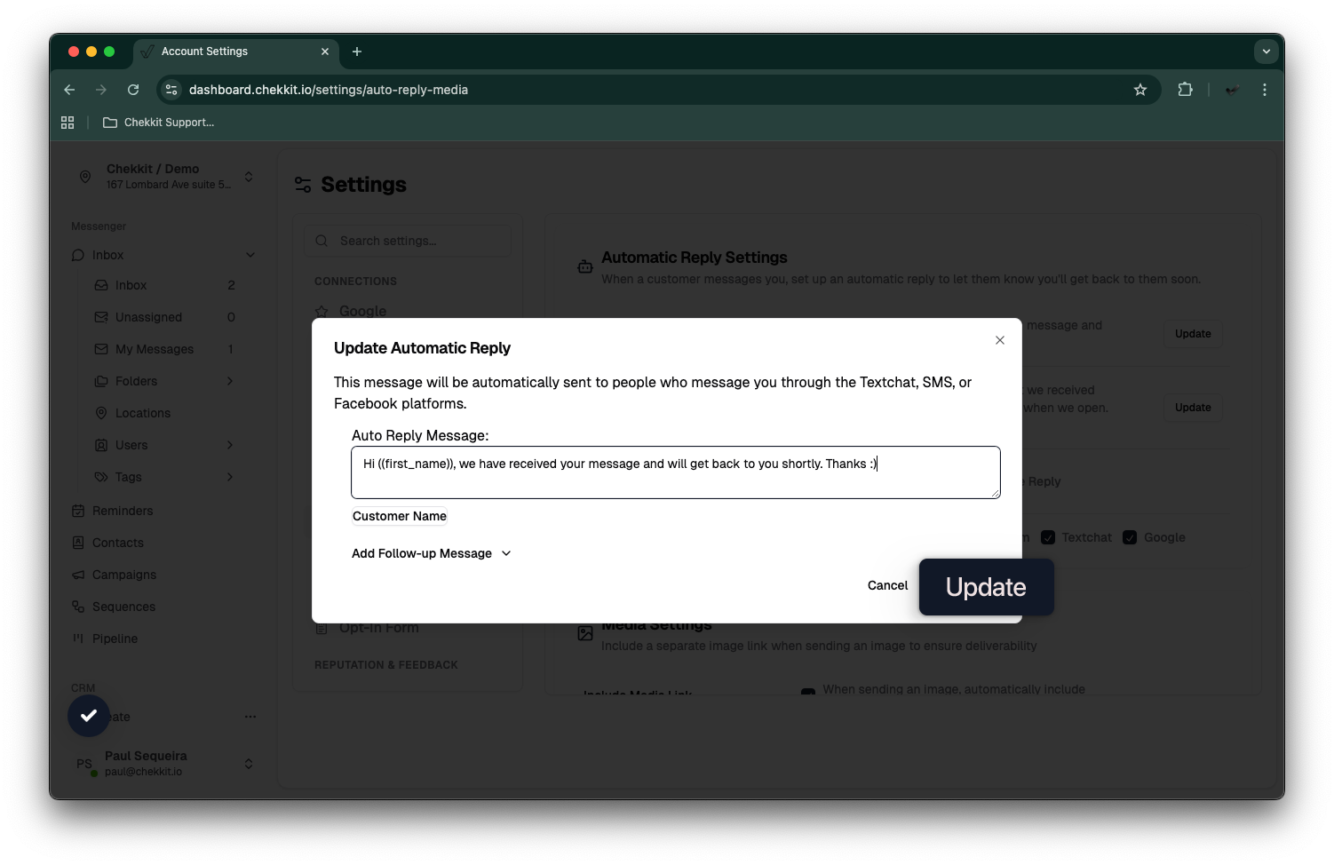 Automatic replies help your business stay responsive by sending an instant message when a customer reaches out. You can use them to confirm you’ve received a message, or to let customers know when you’re closed.