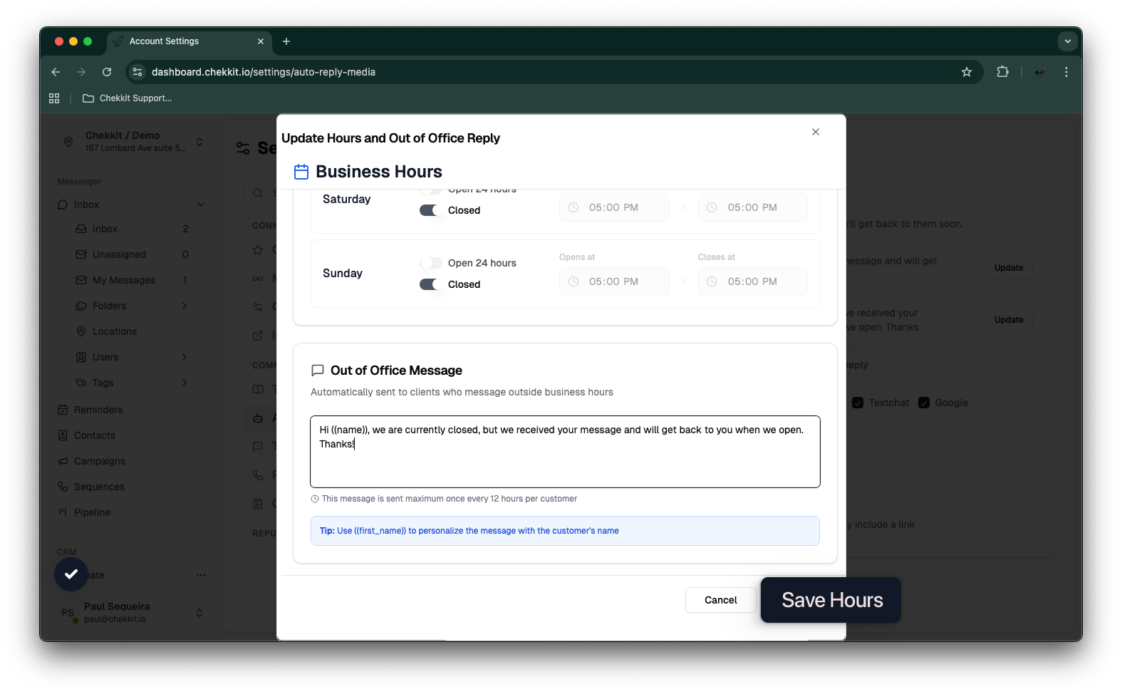 "Hi {{first_name}}, we are currently closed, but we received your message and will get back to you when we open. Thank you!"