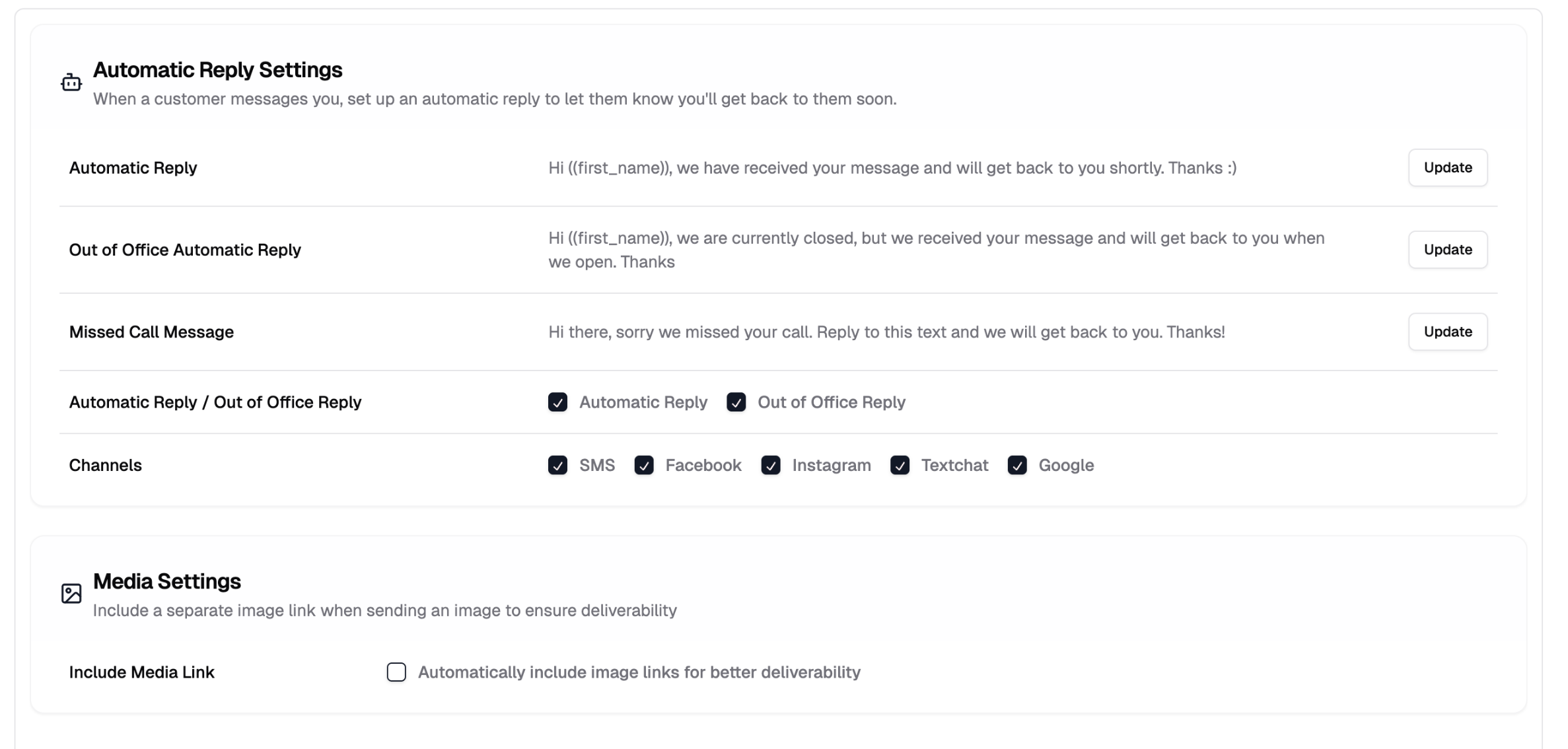 - You’ll see three main sections: Automatic Reply Settings, Missed Call Message, and Media Settings.