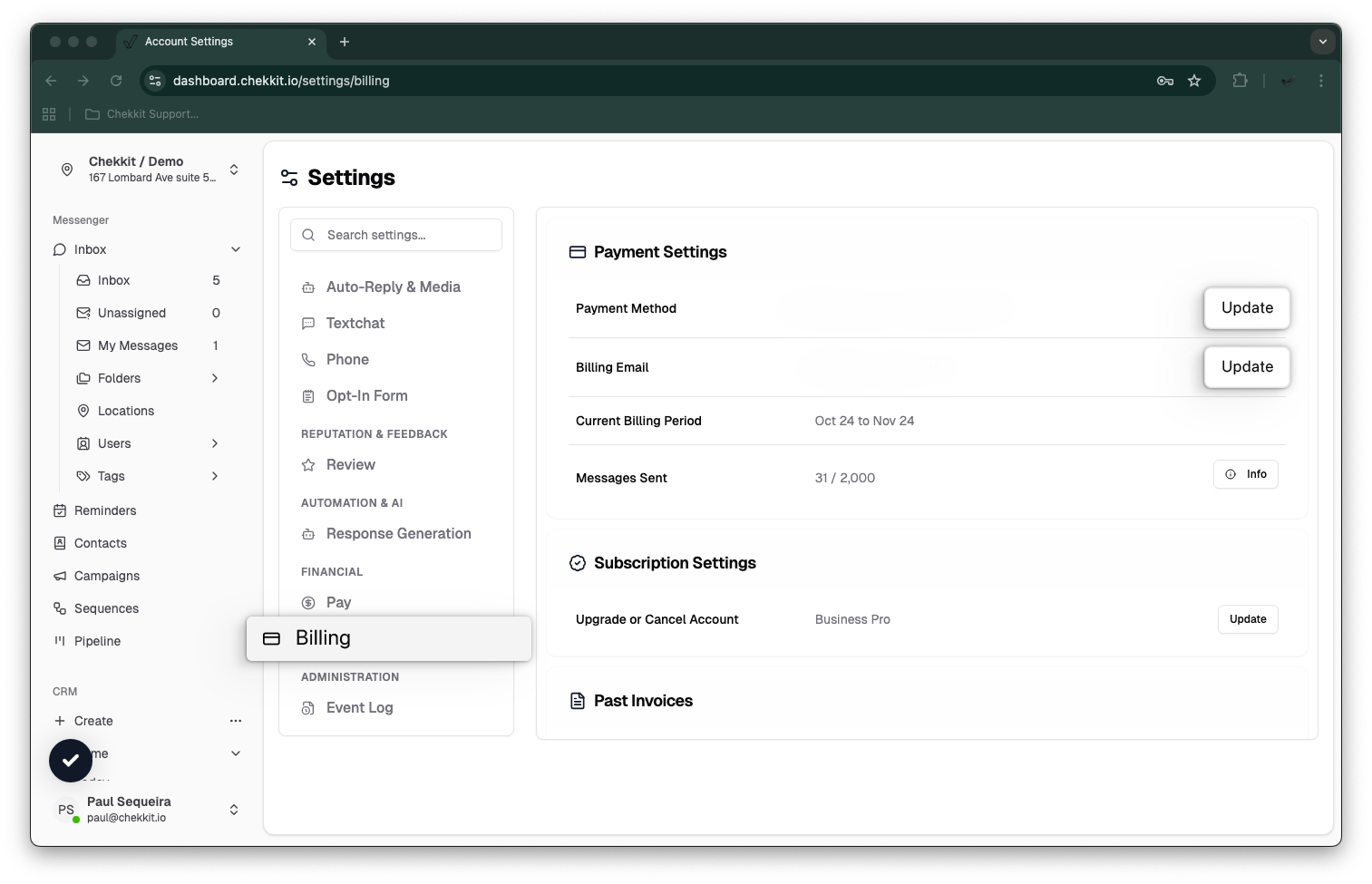 To update your billing information, first navigate to the 'Settings' - 'Billing' page on the desktop version of Chekkit.