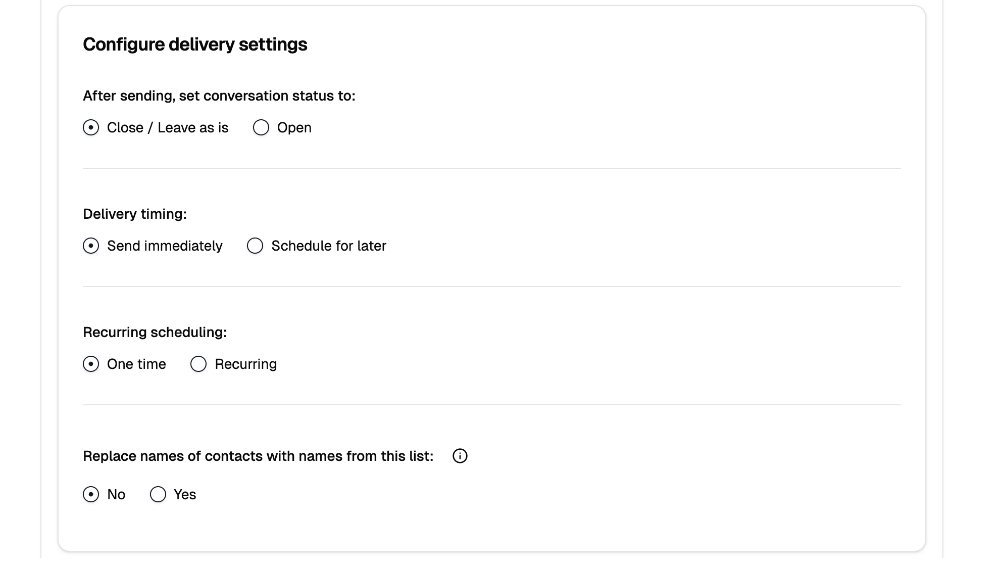 - Now you can choose to have the conversations moved to Closed or Open. If you'd like to have your message sent at a later date, select Later.