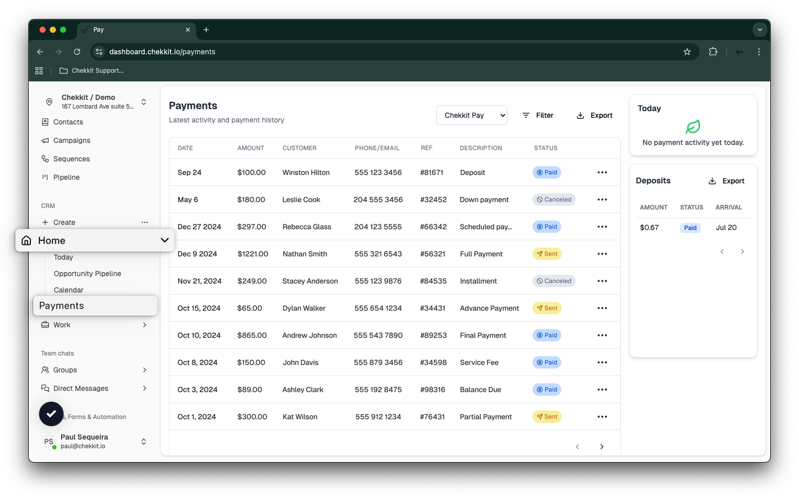 Your first step will be signing into your Chekkit account and navigating to the side menu under Home and select Payments.